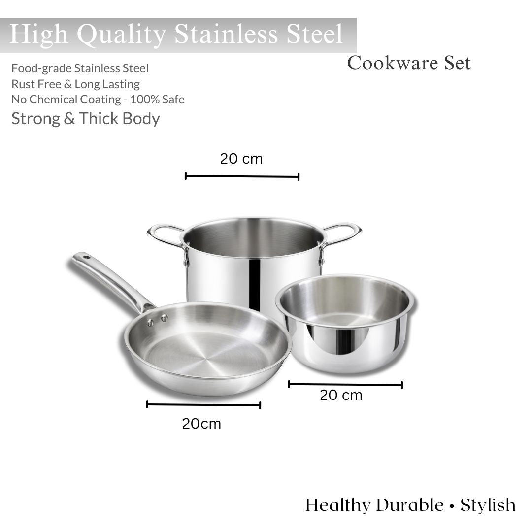 | This stainless steel tri-ply cookware set is designed to deliver consistent cooking performance with superior durability. The tri-ply construction provides uniform heat distribution, reducing hot spots and ensuring evenly cooked food. The set includes a 20 cm cook pot, a 20 cm tope, and a 20 cm frypan, making it ideal for everyday kitchen tasks such as boiling, frying, and simmering. Crafted from premium food-grade stainless steel, this cookware set is easy to maintain, corrosion-resistant, and a reliable addition to any modern kitchen. |